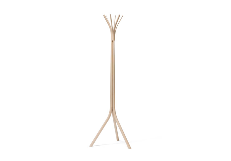 A simple coat stand with clear-cut contours. Fleur was inspired in its entirety by traditional manual wood bending processes. Three beech wood pieces form the stable legs on one side, which are complemented by three additional narrow rods on the opposite side, thus offering ample space for hanging coats. For TON, 2015.